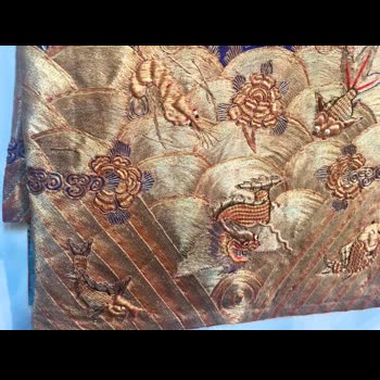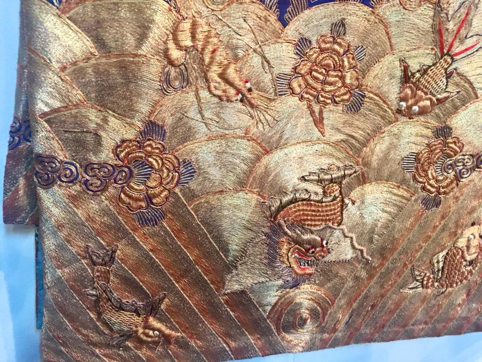 | คำอธิบาย : เสื้อคลุมฮ่องเต้จีน นอกจากจะมีการปักรูปมังกรแล้วยังมีการปักรูปสัตว์อื่นๆ ที่เป็นสัญลักษณ์มงคล เช่น กุ้งและปลา ในน้ำ |