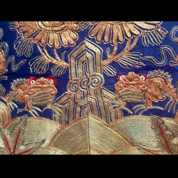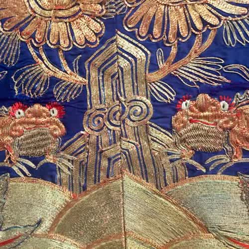 | คำอธิบาย : เสื้อคลุมฮ่องเต้จีน นอกจากจะมีการปักรูปมังกรแล้วยังมีการปักรูปสัตว์อื่นๆ ที่เป็นสัญลักษณ์มงคล เช่น คางคก 3 ขา ตามตำนานที่เล่าขานว่าคางคงยอมสละขา 1 ข้างเพื่อช่วยชีวิตลูกชายฮ่องเต้ไว้ ดังนั้นจึงมีการปักรูปคางคง 3 ขา เพื่อแสดงถึงการปกป้องกันเคราะห์ร้าย |