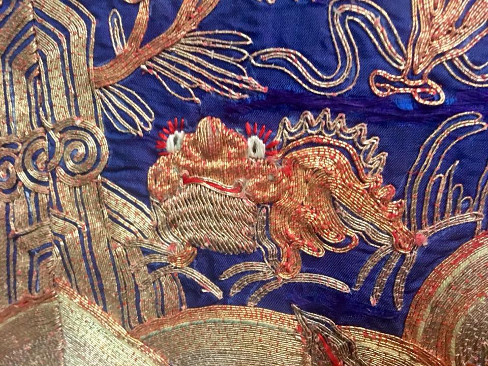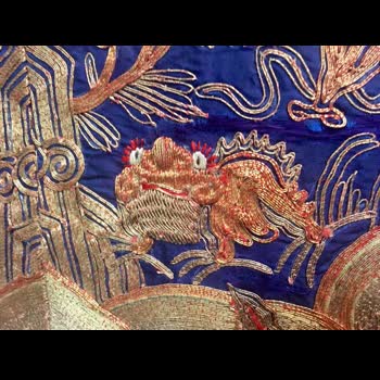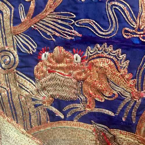 | คำอธิบาย : เสื้อคลุมฮ่องเต้จีน นอกจากจะมีการปักรูปมังกรแล้วยังมีการปักรูปสัตว์อื่นๆ ที่เป็นสัญลักษณ์มงคล เช่น คางคก 3 ขา ตามตำนานที่เล่าขานว่าคางคงยอมสละขา 1 ข้างเพื่อช่วยชีวิตลูกชายฮ่องเต้ไว้ ดังนั้นจึงมีการปักรูปคางคง 3 ขา เพื่อแสดงถึงการปกป้องกันเคราะห์ร้าย |