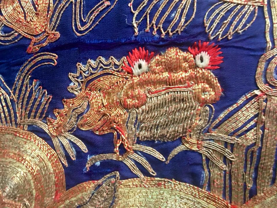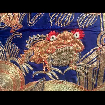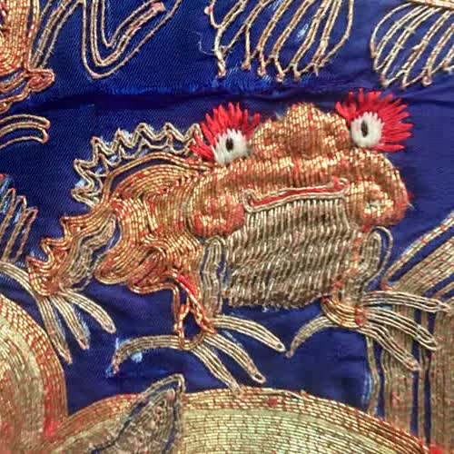 | คำอธิบาย : เสื้อคลุมฮ่องเต้จีน นอกจากจะมีการปักรูปมังกรแล้วยังมีการปักรูปสัตว์อื่นๆ ที่เป็นสัญลักษณ์มงคล เช่น คางคก 3 ขา ตามตำนานที่เล่าขานว่าคางคงยอมสละขา 1 ข้างเพื่อช่วยชีวิตลูกชายฮ่องเต้ไว้ ดังนั้นจึงมีการปักรูปคางคง 3 ขา เพื่อแสดงถึงการปกป้องกันเคราะห์ร้าย |