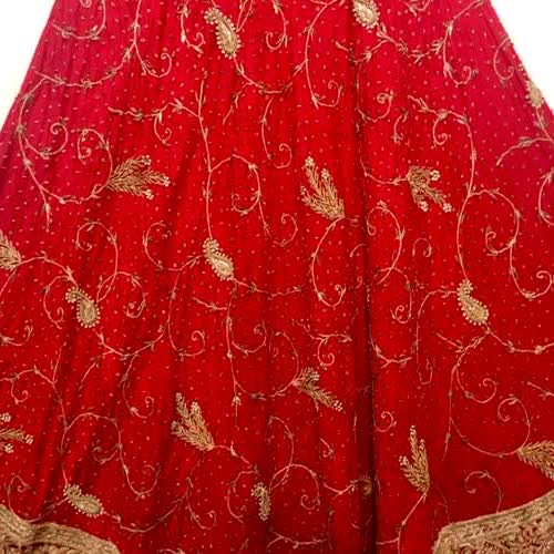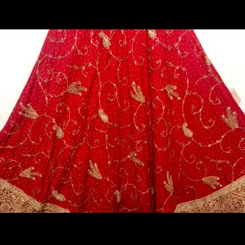 | คำอธิบาย : กระโปรงเจ้าสาวอินเดีย นิยมใช้ผ้าสีแดง ปักด้วยลูกปัดและเลื่อมปักมือ เชิงกระโปรงปักอย่างละเอียดพิถีพิถันเป็นลวดลายต่างๆ ที่นิยมคือลายดอกพิกุลหรือข้าวหลามตัด ความยาวคลุมเท้าเจ้าสาว |
