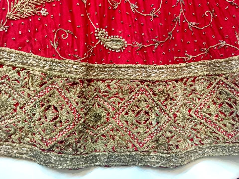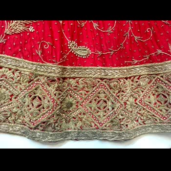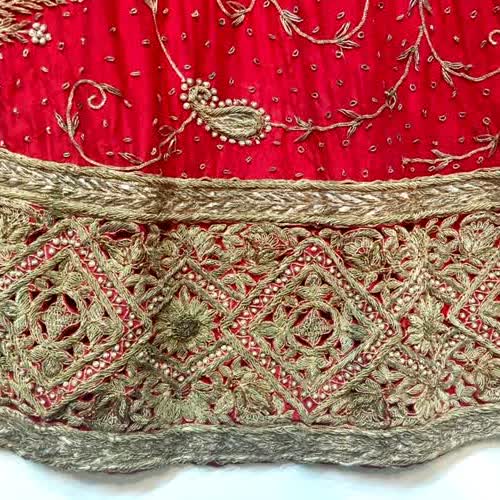 | คำอธิบาย : ชายหรือเชิงกระโปรงเจ้าสาวอินเดีย ปักเป็นลวดลายต่างๆ อย่างละเอียดพิถีพิถัน โดยลายที่นิยมคือลายดอกพิกุลหรือข้าวหลามตัด |