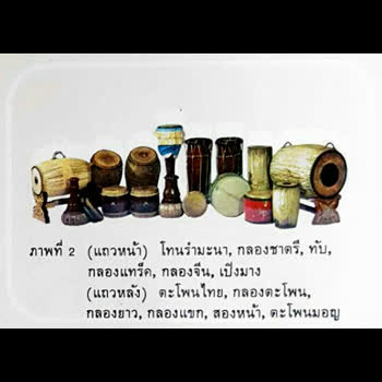 | คำอธิบาย : เครื่องประกอบจังหวะประเภทต่าง ๆ เช่น โทนรำมะนา กลองชาตรี ทับ กลองจั่น เปิงมาง ตะโพนไทย กลองตะโพน กลองยาว กลองแขก สองหน้า ตะโพนมอญ |