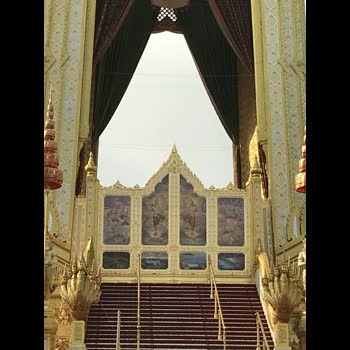 | คำอธิบาย : ฉากบังเพลิง เป็นฉากกั้นทางขึ้นลงพระเมรุมาศในชั้นจิตกาธาน เป็นฉากพับได้ มีทั้ง ๔ ด้าน เพื่อไม่ให้เห็นการถวายพระเพลิงพระบรมศพฯ และใช้บังลม |
