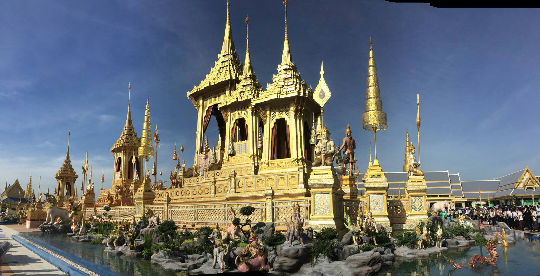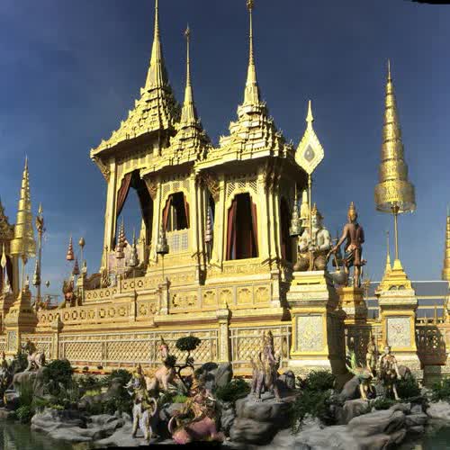 | คำอธิบาย : พระเมรุมาศพระบาทสมเด็จพระปรมินทรมหาภูมิพลอดุลยเดช บรมนาถบพิตร ประกอบด้วย อาคารบุษบก ๙ องค์ เรียกว่าพระเมรุมาศ ๙ ยอด |