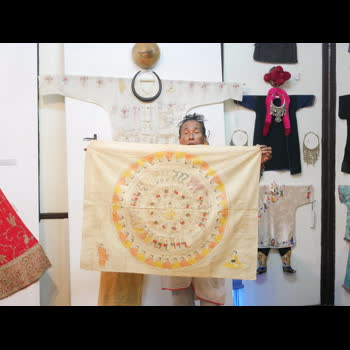 | คำอธิบาย : ผ้ายันต์โบราณจากรัฐฉาน ประเทศพม่า คนที่ทำคือพระ วัตถุประสงค์เพื่อเป็นขวัญกำลังใจและคุ้มครองปกป้องรักษาผู้ครอบครอง |