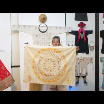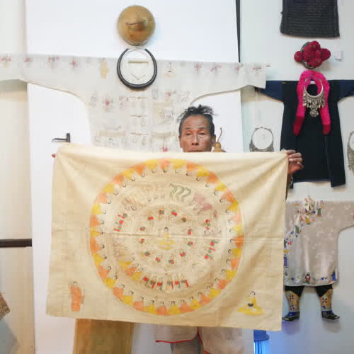 | คำอธิบาย : ผ้ายันต์โบราณจากรัฐฉาน ประเทศพม่า คนที่ทำคือพระ วัตถุประสงค์เพื่อเป็นขวัญกำลังใจและคุ้มครองปกป้องรักษาผู้ครอบครอง |