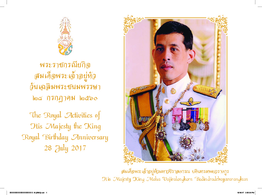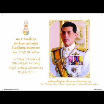 (2561). "แผ่นพับพระราชกรณียกิจสมเด็จพระเจ้าอยู่หัว วันเฉลิมพระชนมพรรษา ๒๘ กรกฏาคม ๒๕๖๐".