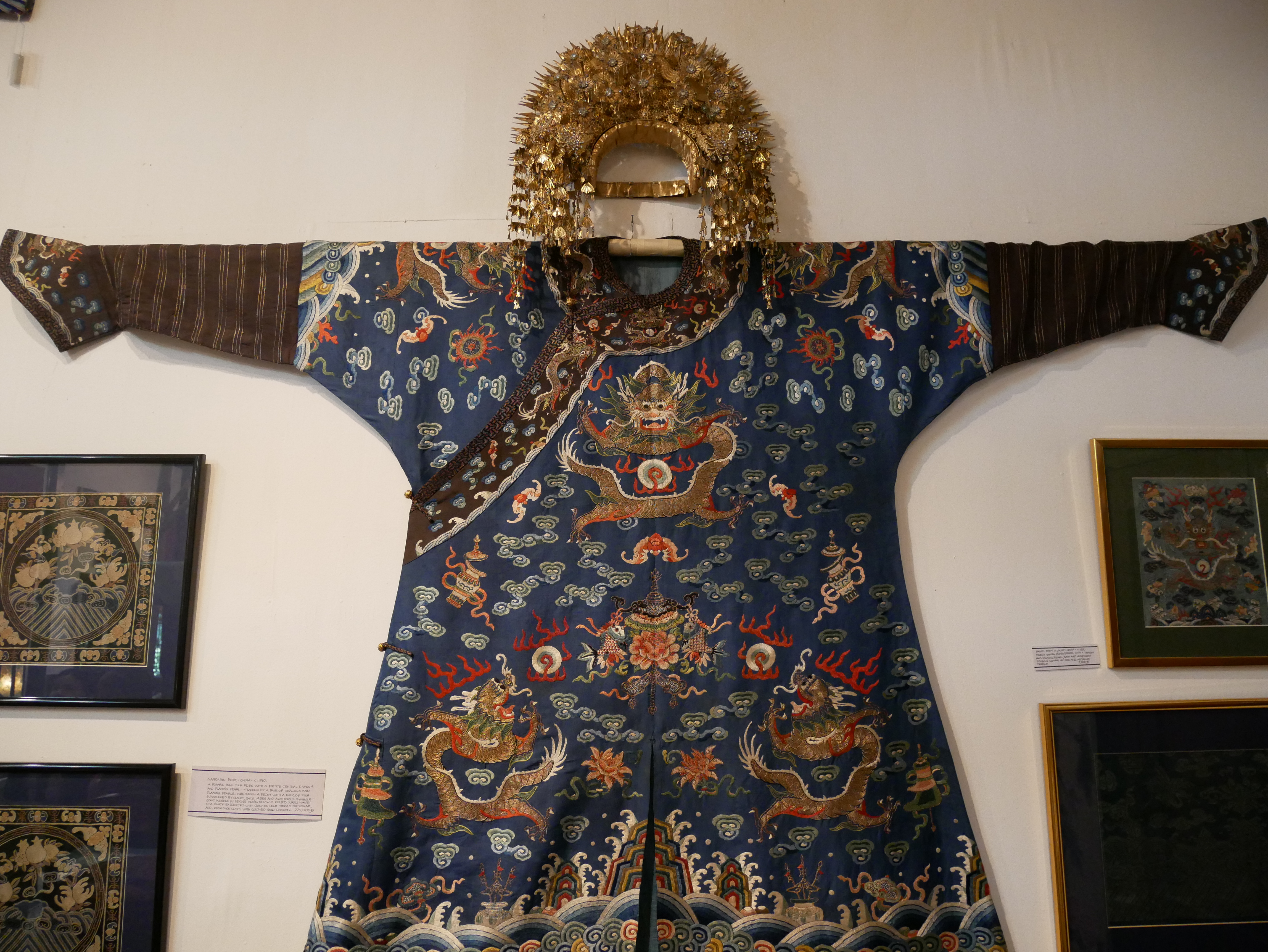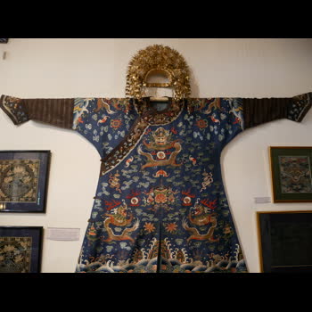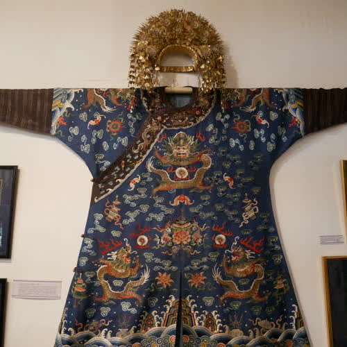 | คำอธิบาย : เสื้อคลุมฮ่องเต้จีนโบราณ ตัวเสื้อมีการปักเป็นรูปสัตว์มงคลต่างๆ ตามความเชื่อ คือ มังกร จำนวนเล็บของมังกรที่ปักบนเสื้อคลุมฮ่องเต้ คือสัญลักษณ์ที่ใช้บอกระดับชั้นความสำคัญและอำนาจของฮ่องเต้ โดยฮ่องเต้ที่มีอำนาจและชั้นตำแหน่งสูงสุดจะสามารถสวมเสื้อคลุมที่ปักรูปมังกร 5 เล็บ ขณะที่ฮ่องเต้ที่มีอำนาจและชั้นตำแหน่งต่ำลงมาก็จะสวมเสื้อคลุมที่ปักรูปมังกร 4 เล็บ หรือน้อยกว่า นอกจากนี้ยังมีการปักรูปสัตว์น้ำ อย่างกุ้งและปลา ที่สำคัญคือคางคก 3 ขา ตามตำนานที่เล่าขานว่าคางคงยอมสละขา 1 ข้างเพื่อช่วยชีวิตลูกชายฮ่องเต้ไว้ ดังนั้นจึงมีการปักรูปคางคง 3 ขา เพื่อแสดงถึงการปกป้องกันเคราะห์ร้าย |
