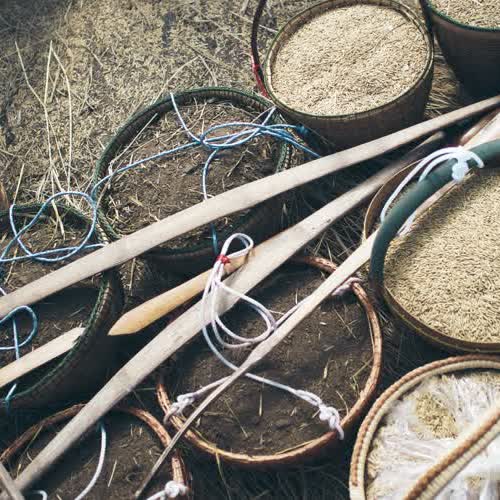 | คำอธิบาย : ข้าวเปลือกและปุ๋ยที่ชาวบ้านนำมาร่วมงานหวัวบุญเบิกฟ้า ปี 2561 |
