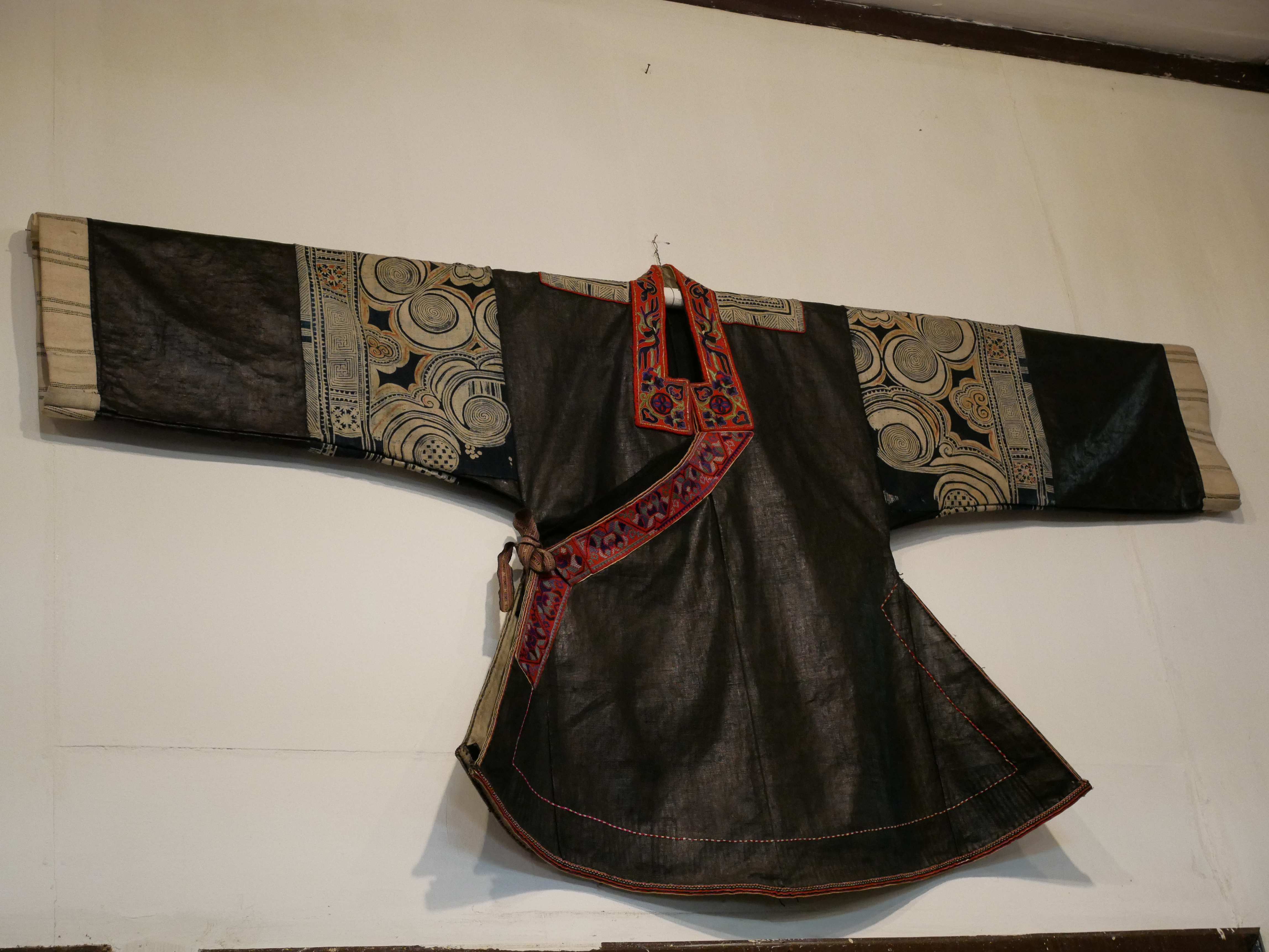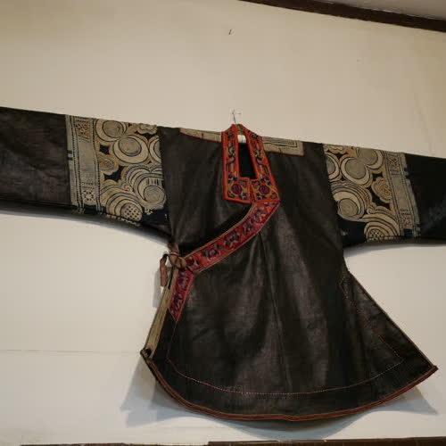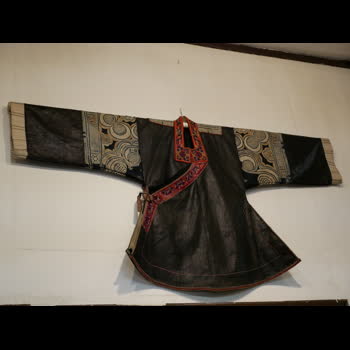 | คำอธิบาย : เสื้อชนเผ่าแม้วจากมณฑลกุ้ยโจว ใช้ไข่ขาวผสมน้ำครามแล้วนำมาย้อมผ้า เพื่อให้ผ้าดูเลื่อมและสามารถกันฝนได้ ดังนั้นหลังจากตัดเย็บเสร็จเรียบร้อยแล้วจะไม่มีการซักเสื้อดังกล่าวเพื่อป้องกันการแตกลายของเนื้อผ้า |