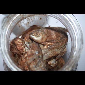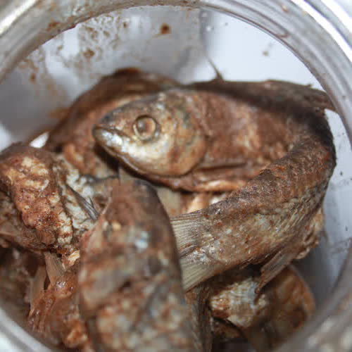 | คำอธิบาย : ตัวอย่างปลาร้าที่มีกรรมวิธีการบ่มหมักปลาเข้ากับเกลือสินเธาว์และข้าวคั่วไว้นานกว่า 6 เดือน |