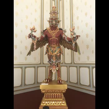 | คำอธิบาย : พญาครุฑ จะตั้งบริเวณฐานชาลา ชั้นที่ ๓ มี ๒ แบบ คือ พญาครุฑถือดอกไม้ทิพย์ และ พญาครุฑพนมมือ พญาครุฑ เป็นพระราชพาหนะของพระนารายณ์ |