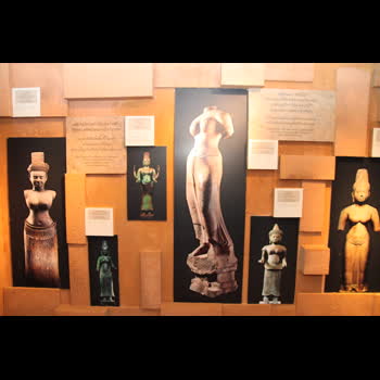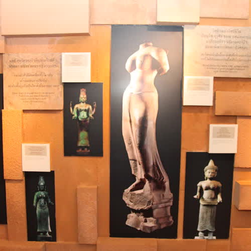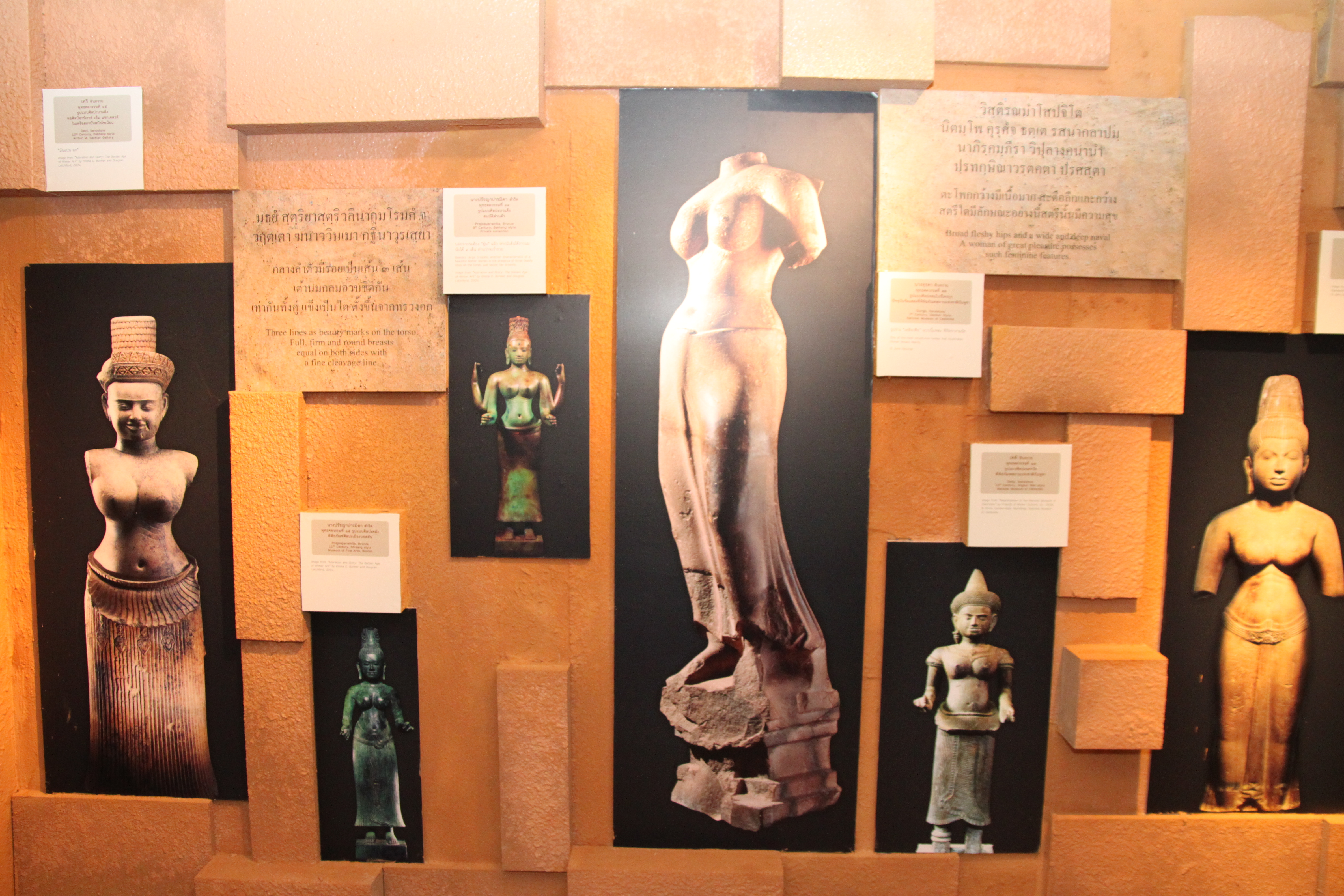 คำอธิบาย : ภาพบรรยากาศภายในนิทรรศการชั่วคราว เรื่อง ไฉไลไปไหน แสดงภาพอุดมคติเกี่ยวกับความสวยของสรีระผู้หญิงผ่านงานประติมากรรมแบบเขมร รูปปั้นเทวีในพุทธศตวรรษที่ 12-15 ที่มีลักษณะสะโพกผาย เอวคอด หน้าอกใหญ่ |