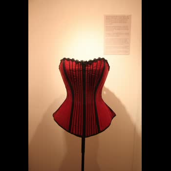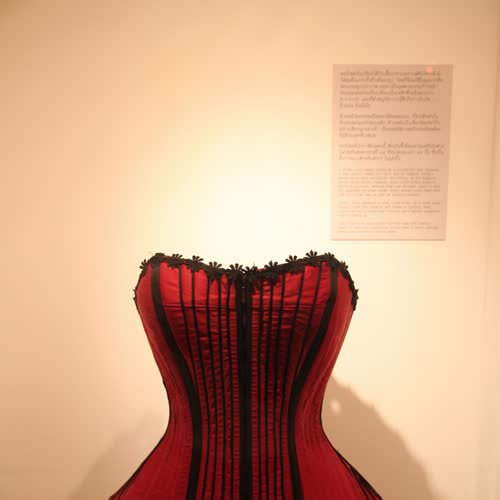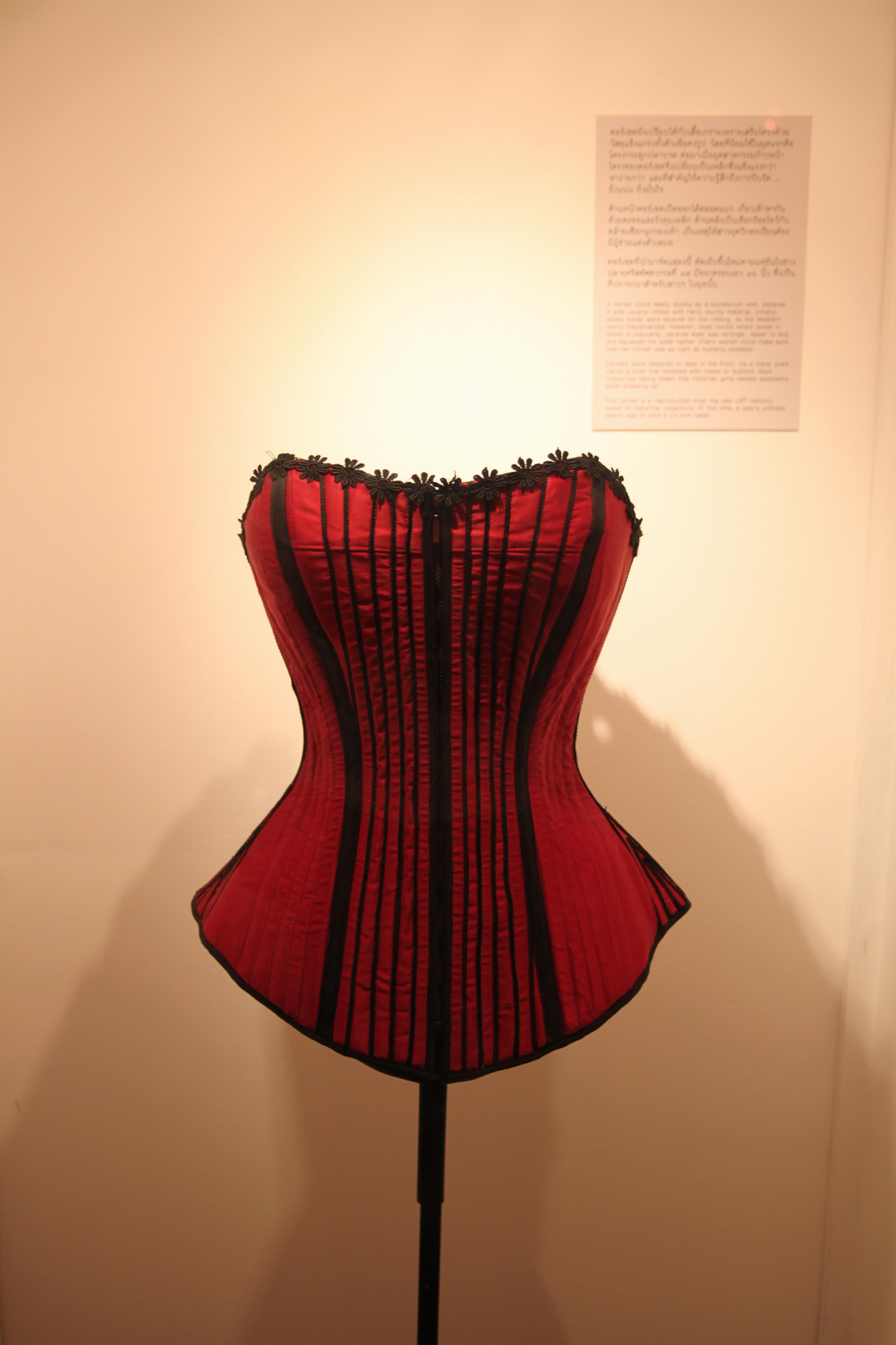 | คำอธิบาย : ภาพบรรยากาศภายในนิทรรศการชั่วคราว เรื่อง ไฉไลไปไหน แสดงตัวอย่างคอร์เซตหรือสเตย์รัดหน้าท้อง ซึ่งเป็นแฟชั่นของหญิงสาวในยุควิคตอเรียน เน้นทำให้ผู้ส่วมใส่มีเอวคอดกิ่วและทรวดทรงดั่งนาฬิกาทราย |