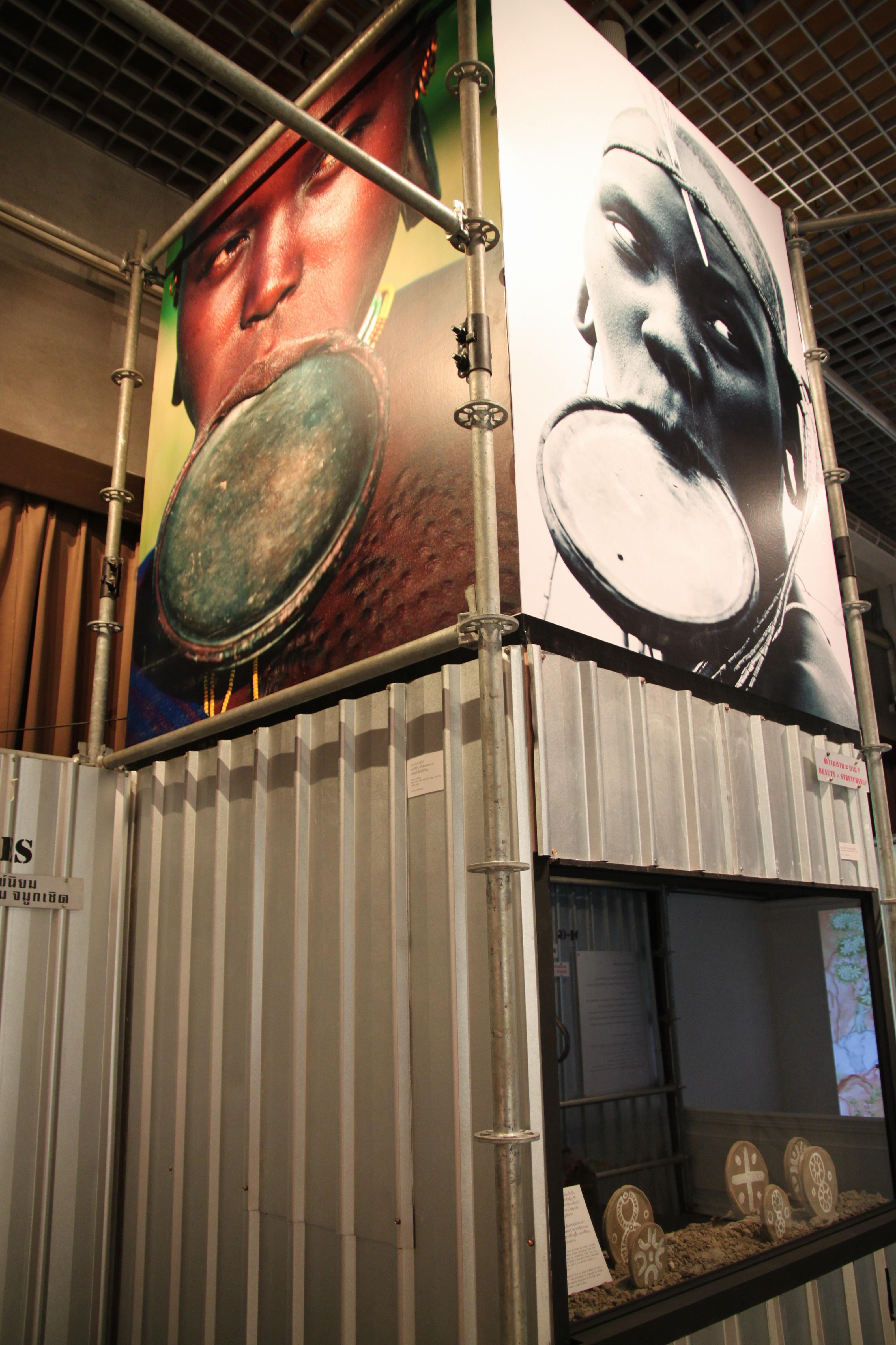 | คำอธิบาย : ภาพบรรยากาศภายในนิทรรศการชั่วคราว เรื่อง ไฉไลไปไหน แสดงภาพถ่ายหญิงสาวเผ่ามูร์ชีกับการเจาะริมฝีปากเพื่อใส่จานที่ทำมาจากดินเหนียวให้ปากบานกว้างสวยงามตามค่านิยมของชนเผ่า |