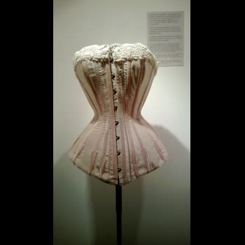 คำอธิบาย : ตัวอย่างชุดคอร์เซตในยุคแรกนิยมนำโครงกระดูกปลาวาฬมาใช้เป็นวัสดุ (ยุคต่อมาเปลี่ยนเป็นเหล็ก) ด้านหน้าคอร์เซตเปิดออกได้ตลอดแนว เกี่ยวเข้าหากันด้วยตะขอ และรังดุมเหล็ก ด้านหลังเป็นเชือกร้อยไขว้กันคล้ายเชือกผูกรองเท้า จึงทำให้สาวยุควิคตอเรียนต้องมีผู้ช่วยแต่งตัวเสมอ |