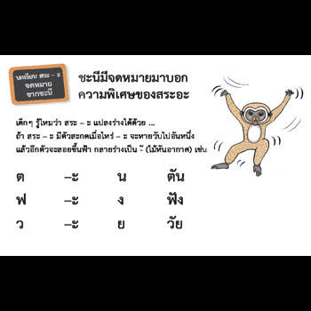บทเรียนสระ -ะ จดหมายจากชะนี ได้รับใบอนุญาตภายใต้ ให้เผยแพร่-โดยต้องระบุที่มาแต่ห้ามดัดแปลงและห้ามใช้เพื่อการค้า 3.0 Thailand.