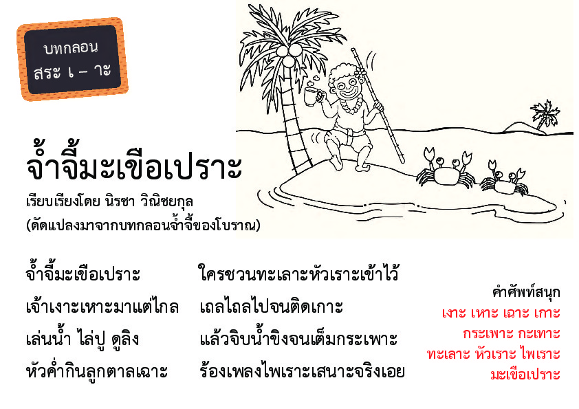 | คำสำคัญ : สระไทย, ภาษาไทย, บทกลอนจ้ำจี้มะเขือเปราะ, บทเรียนสระเ-าะ, เรียนเขียนสระเ-าะ |