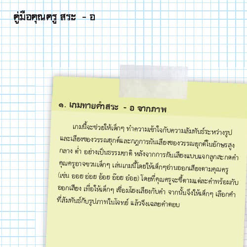 | คำสำคัญ : คู่มือคุณครู สระ-อ, บทเรียนสระ-อ, สระไทย, ภาษาไทย, เรียนเขียนสระ-อ |
