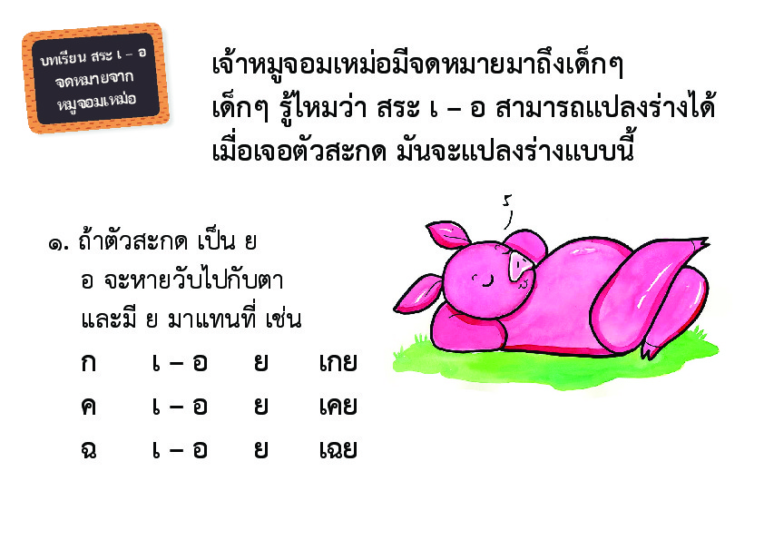 | คำสำคัญ : ภาษาไทย, บทเรียนสระเออ, สระไทย, เรียนเขียนสระเออ, จดหมายจากหมูจอมเหม่อ |