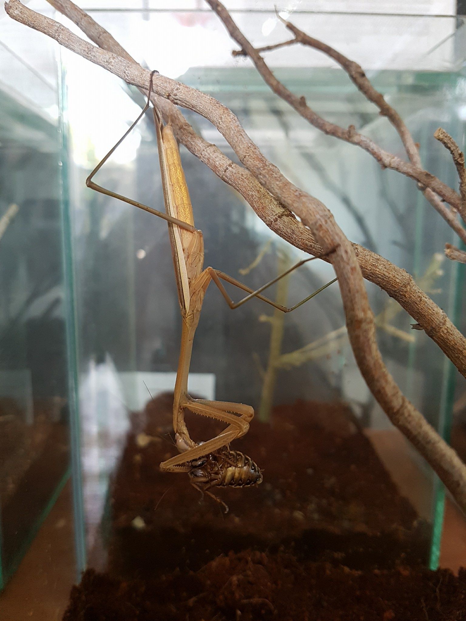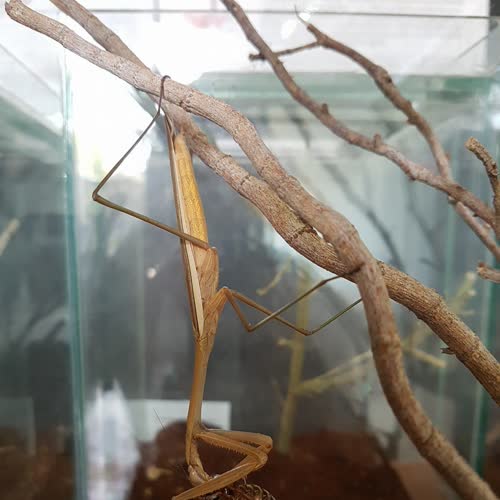 | คำอธิบาย : ตั๊กแตนตำข้าวจีน Tenodera sinensis ตั๊กแตนใช้เวลานานหลายชม.อยู่นิ่งๆ จนกว่าจะมีเหยื่อเดินผ่านมา เมื่อตั๊กแตนพบเหยื่อแล้วจะรอคอยจนกว่าจะได้ระยะที่เหมาะสมและใช้ขาคู่หน้าที่แข็งแรงจับเหยื่อกินเป็นอาหาร อาหารที่ใช้เลี้ยงตั๊กแตนตำข้าวได้แก่ จิ้งหรีด แมลงสาบ ตัวหนอน หรือตั๊กแตนหนวดสั้น |