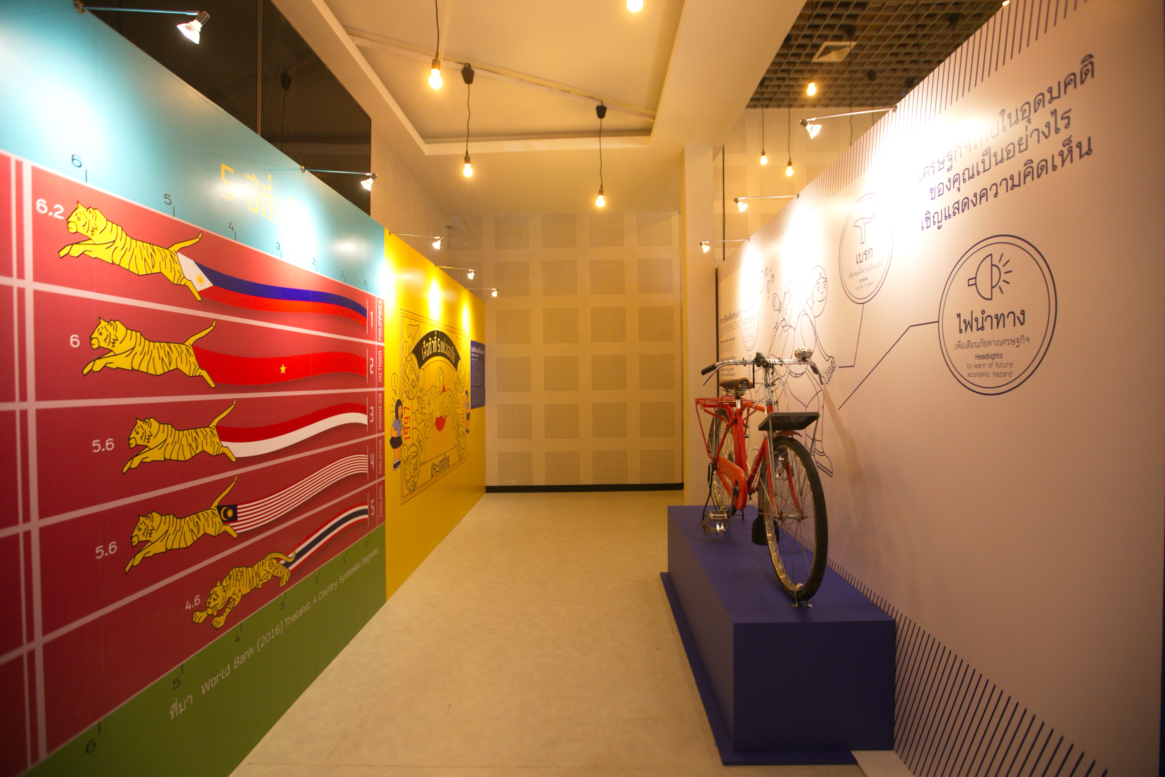 | คำอธิบาย : ภาพบรรยากาศภายในนิทรรศการชั่วคราว เรื่อง ต้มยำกุ้งวิทยา: วิชานี้อย่าเลียน! บอกเล่าการเติบโตอย่างต่อเนื่องของเศรษฐกิจประเทศไทยในทศวรรษ 2530 และคาดการณ์ว่าไทยจะเป็นเสือตัวที่ 5 แห่งเอเชีย แต่พอถึงปี 2540 ไทยต้องประสบกับวิกฤตต้มยำกุ้ง ก่อให้เกิดหนี้จำนวนมหาศาล ส่งผลให้อัตราการเติบโตทางเศรษฐกิจของประเทศไทยยังคงตกต่ำจนถึงปัจจุบัน |