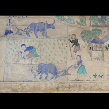 | คำอธิบาย : จิตรกรรมฝาผนังฮูปแต้มวัดโพธาราม จังหวัดมหาสารคาม แสดงภาพวาดการทำนาแบบดำนา และใช้แรงงานจากควายไถนาสะท้อนถึง วิถีวัฒนธรรมของชาวนาในสมัยรัชกาลที่ 5 |
