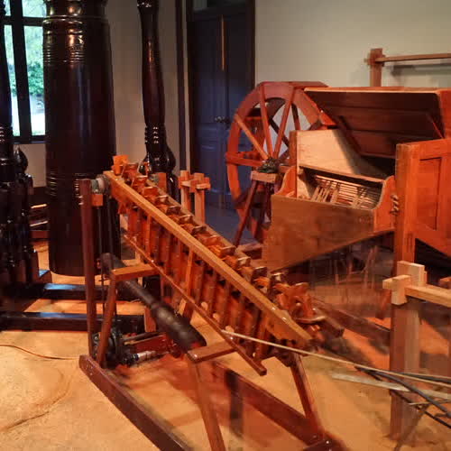 | คำอธิบาย : ภาพบรรยากาศภายในนิทรรศการชั่วคราว เรื่อง ไทยทำ ทำทำไม แสดงระหัดวิดน้ำแบบราง เป็นเครื่องทุ่นแรงในการวิดน้ำเข้านา |