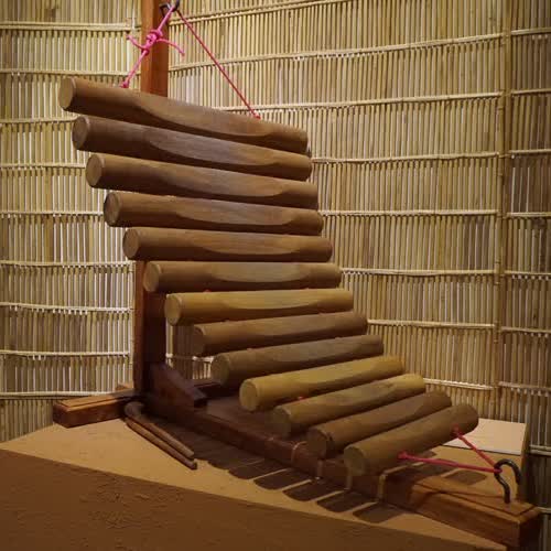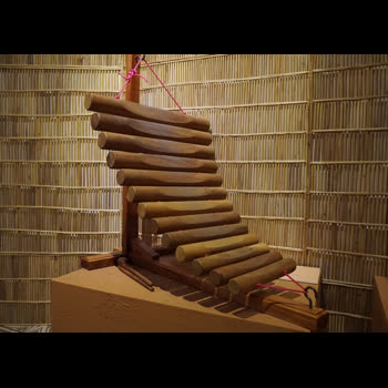 | คำอธิบาย : ภาพบรรยากาศภายในนิทรรศการชั่วคราว เรื่อง ไทยทำ ทำทำไม แสดงโปงลาง นิยมทำจากไม้มะหาด หรือไม้หมากเหลื้อมเพราะมีความอยู่ตัวมากกว่าไม้ชนิดอื่น |
