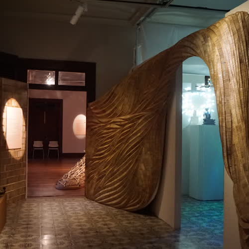 คำอธิบาย : ภาพภายในนิทรรศการชั่วคราว เรื่อง ไทยทำ ทำทำไม จำลองร้านกาแฟแบบไทยร่วมสมัย โดยคุณทรงกลด บางยี่ขัน (ภัณฑารักษ์รับเชิญ) ด้วยการใช้เครื่องจักสานพื้นบ้านมาตกแต่ง |