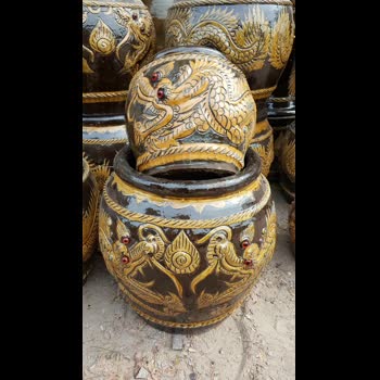 คำอธิบาย : โอ่งมังกร มีลักษณะเป็นลวดลายมังกรรอบโอ่งมีทั้งแบบที่วาดด้วยสีหรือปั้นขึ้นรูปนูนต่ำออกจากผิวโอ่ง ขนาดความสูงส่วนใหญ่ประมาณ 0.5 เมตรถึง 1.5 เมตร เดิมทีเป็นสินค้าที่ต้องนำเข้าจากทางประเทศจีนแต่ภายหลังได้มีการทดลองทำขึ้นภายในประเทศเพื่อให้สามารถรองรับความต้องการใช้โอ่งมังกรภายในประเทศและแก้ปัญหาการนำเข้าสินค้าจากจีนที่เป็นไปด้วยความลำบากในช่วงสมัยหลังสงครามโลกครั้งที่สอง... / โอ่งมังกรแต่เดิมไม่มีการสร้างลวดลายจึงเรียกว่าโอ่งเลี่ยนแต่มีการเพิ่มลายเข้ามาในภายหลังและลายที่มักจะได้รับความนิยมก็คือลายมังกรจึงเรียกว่าโอ่งมังกร และเนื่องจากถือว่ามังกรเป็นสัตว์มงคลตามคติความเชื่อของคนเชื้อสายจีน มังกรที่จะนำมาใช้เป็นลวดลายของโอ่งมังกรก็แบ่งออกเป็นหลายประเภทเช่นมังกรที่มี 3 เล็บหรือ 4 เล็บจะขายกับผู้ซื้อทั่วไปแต่มังกร 5 เล็บจะเป็นของชนชั้นสูง... |