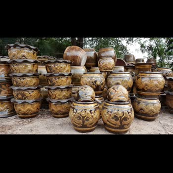 | คำอธิบาย : โอ่งมังกร มีลักษณะเป็นลวดลายมังกรรอบโอ่งมีทั้งแบบที่วาดด้วยสีหรือปั้นขึ้นรูปนูนต่ำออกจากผิวโอ่ง ขนาดความสูงส่วนใหญ่ประมาณ 0.5 เมตรถึง 1.5 เมตร เดิมทีเป็นสินค้าที่ต้องนำเข้าจากทางประเทศจีนแต่ภายหลังได้มีการทดลองทำขึ้นภายในประเทศเพื่อให้สามารถรองรับความต้องการใช้โอ่งมังกรภายในประเทศและแก้ปัญหาการนำเข้าสินค้าจากจีนที่เป็นไปด้วยความลำบากในช่วงสมัยหลังสงครามโลกครั้งที่สอง... / โอ่งมังกรแต่เดิมไม่มีการสร้างลวดลายจึงเรียกว่าโอ่งเลี่ยนแต่มีการเพิ่มลายเข้ามาในภายหลังและลายที่มักจะได้รับความนิยมก็คือลายมังกรจึงเรียกว่าโอ่งมังกร และเนื่องจากถือว่ามังกรเป็นสัตว์มงคลตามคติความเชื่อของคนเชื้อสายจีน มังกรที่จะนำมาใช้เป็นลวดลายของโอ่งมังกรก็แบ่งออกเป็นหลายประเภทเช่นมังกรที่มี 3 เล็บหรือ 4 เล็บจะขายกับผู้ซื้อทั่วไปแต่มังกร 5 เล็บจะเป็นของชนชั้นสูง... |