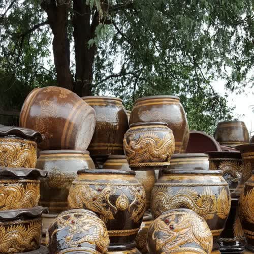 | คำอธิบาย : โอ่งมังกร มีลักษณะเป็นลวดลายมังกรรอบโอ่งมีทั้งแบบที่วาดด้วยสีหรือปั้นขึ้นรูปนูนต่ำออกจากผิวโอ่ง ขนาดความสูงส่วนใหญ่ประมาณ 0.5 เมตรถึง 1.5 เมตร เดิมทีเป็นสินค้าที่ต้องนำเข้าจากทางประเทศจีนแต่ภายหลังได้มีการทดลองทำขึ้นภายในประเทศเพื่อให้สามารถรองรับความต้องการใช้โอ่งมังกรภายในประเทศและแก้ปัญหาการนำเข้าสินค้าจากจีนที่เป็นไปด้วยความลำบากในช่วงสมัยหลังสงครามโลกครั้งที่สอง...โอ่งมังกรแต่เดิมไม่มีการสร้างลวดลายจึงเรียกว่าโอ่งเลี่ยนแต่มีการเพิ่มลายเข้ามาในภายหลังและลายที่มักจะได้รับความนิยมก็คือลายมังกรจึงเรียกว่าโอ่งมังกร และเนื่องจากถือว่ามังกรเป็นสัตว์มงคลตามคติความเชื่อของคนเชื้อสายจีน มังกรที่จะนำมาใช้เป็นลวดลายของโอ่งมังกรก็แบ่งออกเป็นหลายประเภทเช่นมังกรที่มี 3 เล็บหรือ 4 เล็บจะขายกับผู้ซื้อทั่วไปแต่มังกร 5 เล็บจะเป็นของชนชั้นสูง... |