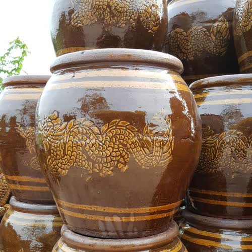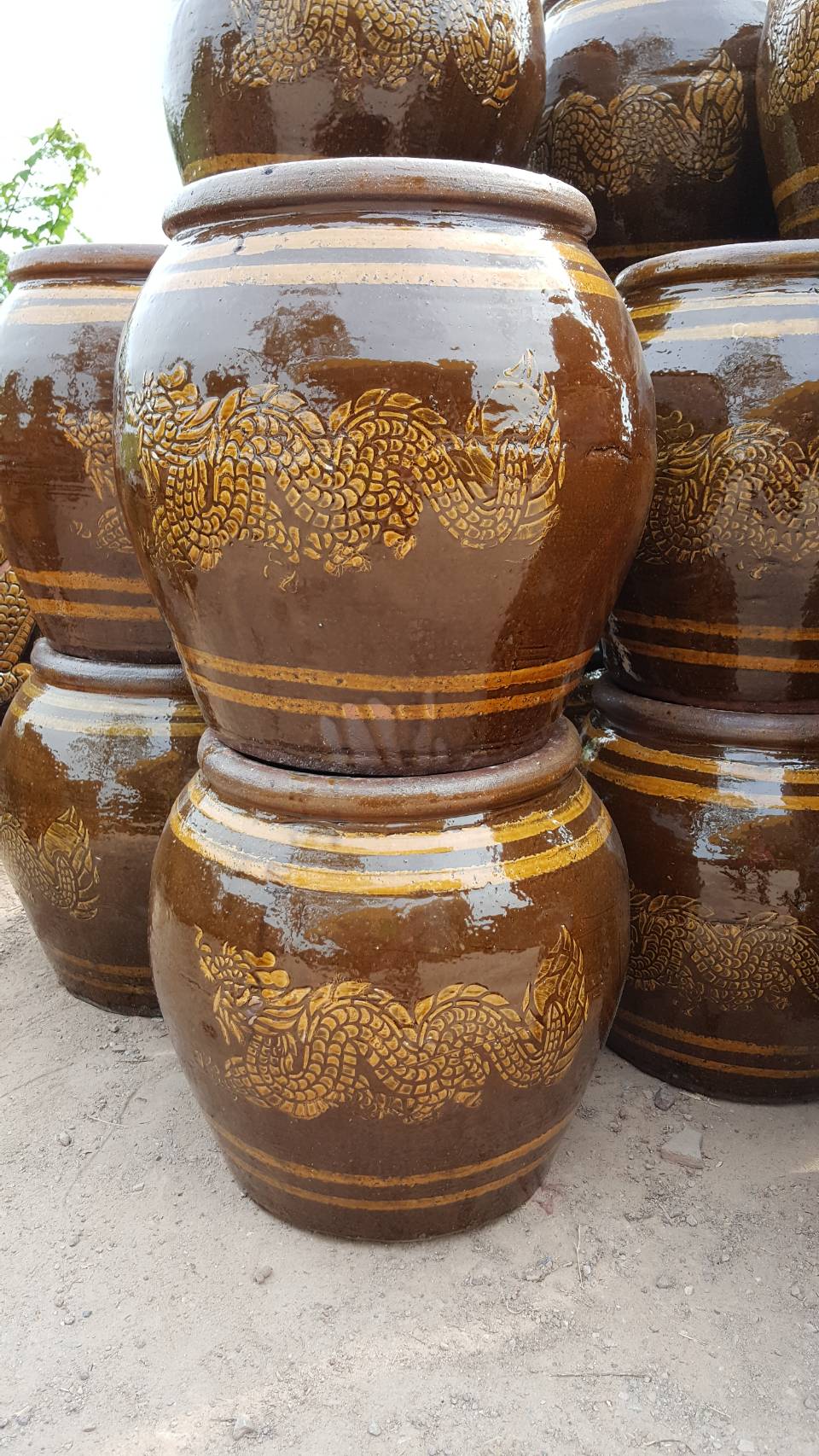 | คำอธิบาย : โอ่งมังกร มีลักษณะเป็นลวดลายมังกรรอบโอ่งมีทั้งแบบที่วาดด้วยสีหรือปั้นขึ้นรูปนูนต่ำออกจากผิวโอ่ง ขนาดความสูงส่วนใหญ่ประมาณ 0.5 เมตรถึง 1.5 เมตร เดิมทีเป็นสินค้าที่ต้องนำเข้าจากทางประเทศจีนแต่ภายหลังได้มีการทดลองทำขึ้นภายในประเทศเพื่อให้สามารถรองรับความต้องการใช้โอ่งมังกรภายในประเทศและแก้ปัญหาการนำเข้าสินค้าจากจีนที่เป็นไปด้วยความลำบากในช่วงสมัยหลังสงครามโลกครั้งที่สอง... / โอ่งมังกรแต่เดิมไม่มีการสร้างลวดลายจึงเรียกว่าโอ่งเลี่ยนแต่มีการเพิ่มลายเข้ามาในภายหลังและลายที่มักจะได้รับความนิยมก็คือลายมังกรจึงเรียกว่าโอ่งมังกร และเนื่องจากถือว่ามังกรเป็นสัตว์มงคลตามคติความเชื่อของคนเชื้อสายจีน มังกรที่จะนำมาใช้เป็นลวดลายของโอ่งมังกรก็แบ่งออกเป็นหลายประเภทเช่นมังกรที่มี 3 เล็บหรือ 4 เล็บจะขายกับผู้ซื้อทั่วไปแต่มังกร 5 เล็บจะเป็นของชนชั้นสูง... |