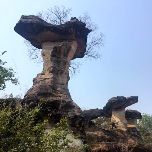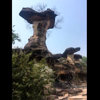 | คำอธิบาย : เสาเฉลียง แผลงมาจาก สะเลียง แปลว่า เสาหิน เสาเฉลียงเป็นเสาหินทรายสูงประมาณ 20 เมตร เกิดจากกระบวนการกัดเซาะและกัดกร่อนด้วยอิทธิพลของน้ำและกรวดที่ลมพัดพามาเป็นเวลาหลายล้านปี เสาเฉลียงพบกระจายอยู่ตามลานหินในอุทยานแห่งชาติผาแต้ม อ.โขงเจียม จ.อุบลราชธานี |