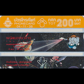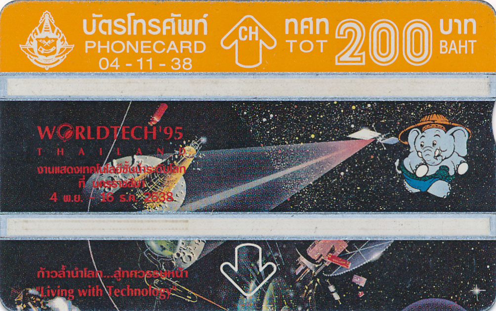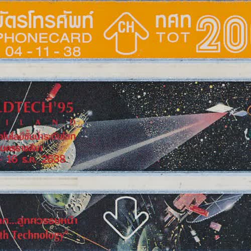 | คำอธิบาย : WORLDTECH\\\'95 THAILAND งานแสดงเทคโนโลยีชั้นนำระดับโลก ที่ นครราชสีมา ๔ พ.ย. - ๑๖ ธ.ค. ๒๕๓๘ องค์การโทรศัพท์แห่งประเทศไทย ได้ออกบัตรโทรศัพท์ที่ใช้กับเครื่องโทรศัพท์สาธารณะ ภายใต้เงื่อนไขและข้อกำหนดขององค์การโทรศัพท์ฯ โดยระบุจำนวนเงินและวันหมดอายุไว้ ภาพที่หน้าบัตรแสดงตามวาระสำคัญ สถานที่ สัตว์ ขนม ผลไม้ |