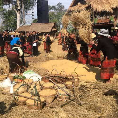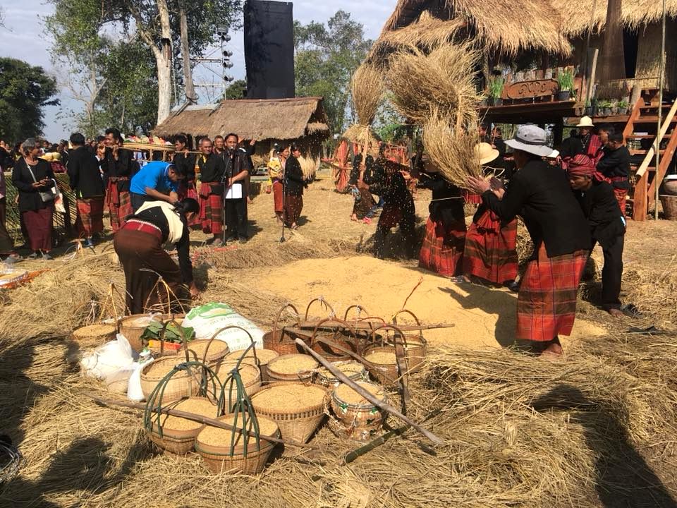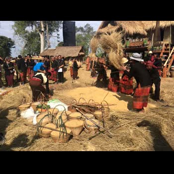 | คำอธิบาย : การนวดข้าว หมายถึง การทำให้ข้าวเปลือกหลุดจากรวงข้าว ผู้ที่ทำหน้าที่นวดข้าวจะใช้ไม้หนีบกำรวงข้าว เอาฟาดไปบนอุปกรณ์ที่ใช้รองรับในลาดนวดข้าว กิจกรรมในงานประเพณีหวัวบุญเบิกฟ้า ณ ปราสาทปรางค์กู่ ในงานหวัวบุญเบิกฟ้า ขึ้น 3 ค่ำ มหัศจรรย์เดือน 3 อ.ปรางค์กู่ จ.ศรีสะเกษ |