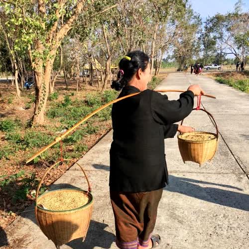 | คำอธิบาย : ชาวบ้านหาบข้าวเปลือกไปนำไปประกอบพิธีสู่ขวัญข้าว พิธีกรรมหนึ่งในประเพณีหวัวบุญเบิกฟ้า ขึ้น 3 ค่ำ มหัศจรรย์เดือน 3 ของชุมชนชาวกูยบ้านกู่ อ.ปรางค์กู่ จ.ศรีสะเกษ |