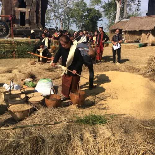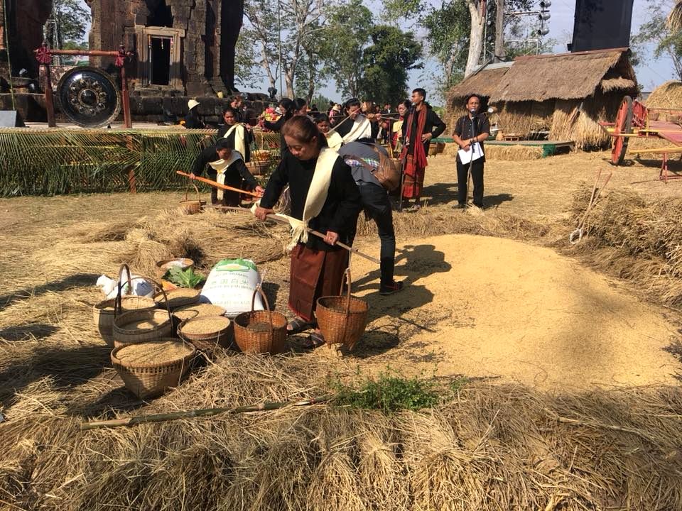 | คำอธิบาย : พิธีสู่ขวัญข้าว พิธีกรรมหนึ่งในประเพณีหวัวบุญเบิกฟ้า ขึ้น 3 ค่ำ มหัศจรรย์เดือน 3 ของชุมชนชาวกูยบ้านกู่ อ.ปรางค์กู่ จ.ศรีสะเกษ เพื่อแสดงความกตัญญูต่อพระแม่โพสพ เพื่อความสบายใจในการซื้อขายข้าว และเพื่อให้การแบ่งปันข้าวแก่ญาติมิตรผู้มาร่วมพิธี |