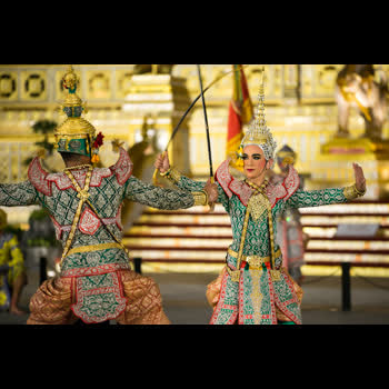 | คำอธิบาย : โขนเรื่องรามเกียรติ์ มหรสพสมโภชออกพระเมรุ 02.12.2560 พระรามข้ามสมุทร-ยกรบ-รำสำนึกในพระมหากรุณาธิคุณ ฉากนี้เป็นการต่อสู้ระหว่างพระราม พระลักษมณ์ หนุมาน และ ทศกัณฐ์ The khon masked drama was performed in front of Phra Thinang Songtham, or the Royal Merit-Making Pavilion, the Royal Crematorium for His Majesty King Bhumibol Adulyadej. In this scene: the fight of Rama, Lakshmana, Hanuman and Ravana (Tosakan) |