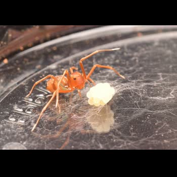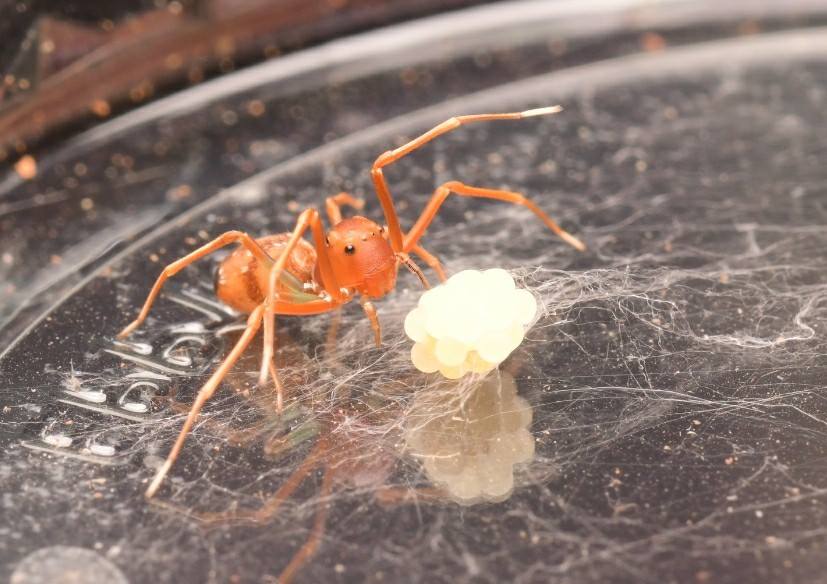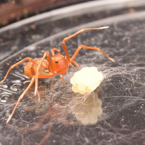 | คำอธิบาย : #แมงมุมมดแดง ในกระปุกเพาะเลี้ยงเกาะอยู่บนเส้นใยและมีกลุ่มก้อนสีขาวๆที่น่าจะเป็นไข่เกาะรวมกลุ่มกันอยู่ ตัวนี้เลี้ยงในกระปุกขนาดเล็ก และให้กินมดแดงซึ่งหาได้ทั่วไปในธรรมชาติเป็นอาหาร แมงมุมมดแดงจะทำตัวเลียนแบบมดอาศัยปะปนกับกลุ่มมดแดงเพื่อจับมดกิน สามารถยกขาคู่หน้าเพื่อทำตัวเลียนแบบหนวดของมดแดงได้อีกด้วย ทั้งนี้เพื่อเป็นการป้องกันตนเองจากมดแดงซึ่งสามารถเป็นผู้ล่าอีกชนิดหนึ่งเช่นกันMyrmaplata plataleoides (O. Pickard-Cambridge, 1869) อยู่ในวงศ์แมงมุมกระโดด (Salticidae) สกุลเดิมที่รู้จักกันคือ Myrmarachne |