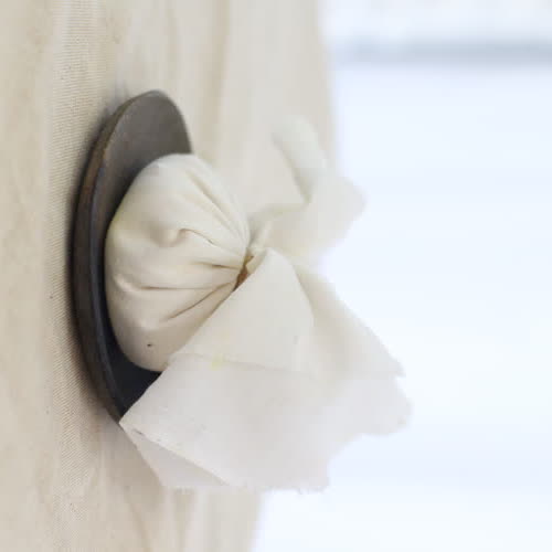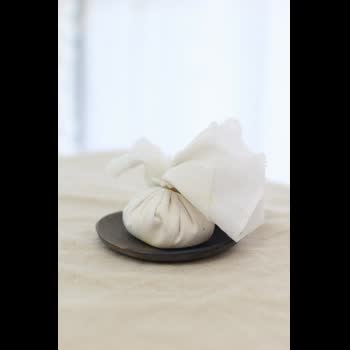 | คำอธิบาย : ลูกประคบดินสอพอง ภายในบรรจุดินสอพองที่คั่วแล้วใช้สำหรับการโปรยแบบปรุ |