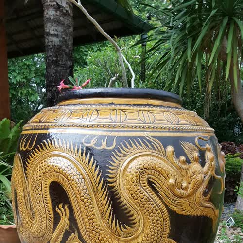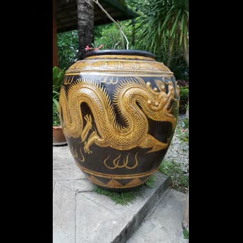 | คำอธิบาย : โอ่งมังกร มีลักษณะเป็นลวดลายมังกรรอบโอ่งมีทั้งแบบที่วาดด้วยสีหรือปั้นขึ้นรูปนูนต่ำออกจากผิวโอ่ง ขนาดความสูงส่วนใหญ่ประมาณ 0.5 เมตรถึง 1.5 เมตร เดิมทีเป็นสินค้าที่ต้องนำเข้าจากทางประเทศจีนแต่ภายหลังได้มีการทดลองทำขึ้นภายในประเทศเพื่อให้สามารถรองรับความต้องการใช้โอ่งมังกรภายในประเทศและแก้ปัญหาการนำเข้าสินค้าจากจีนที่เป็นไปด้วยความลำบากในช่วงสมัยหลังสงครามโลกครั้งที่สอง...โอ่งมังกรแต่เดิมไม่มีการสร้างลวดลายจึงเรียกว่าโอ่งเลี่ยนแต่มีการเพิ่มลายเข้ามาในภายหลังและลายที่มักจะได้รับความนิยมก็คือลายมังกรจึงเรียกว่าโอ่งมังกร และเนื่องจากถือว่ามังกรเป็นสัตว์มงคลตามคติความเชื่อของคนเชื้อสายจีน มังกรที่จะนำมาใช้เป็นลวดลายของโอ่งมังกรก็แบ่งออกเป็นหลายประเภทเช่นมังกรที่มี 3 เล็บหรือ 4 เล็บจะขายกับผู้ซื้อทั่วไปแต่มังกร 5 เล็บจะเป็นของชนชั้นสูง... |