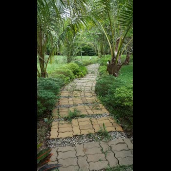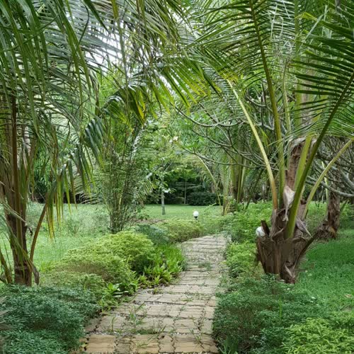 คำอธิบาย : ทางเดินเข้าไปชมสวน ในรีสอร์ท ตกแต่งพรรณไม้ต่างๆ อย่างสวยงาม เป็นสถานที่ที่พักผ่อนในวันหยด |