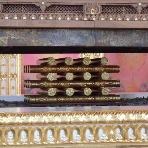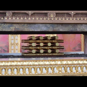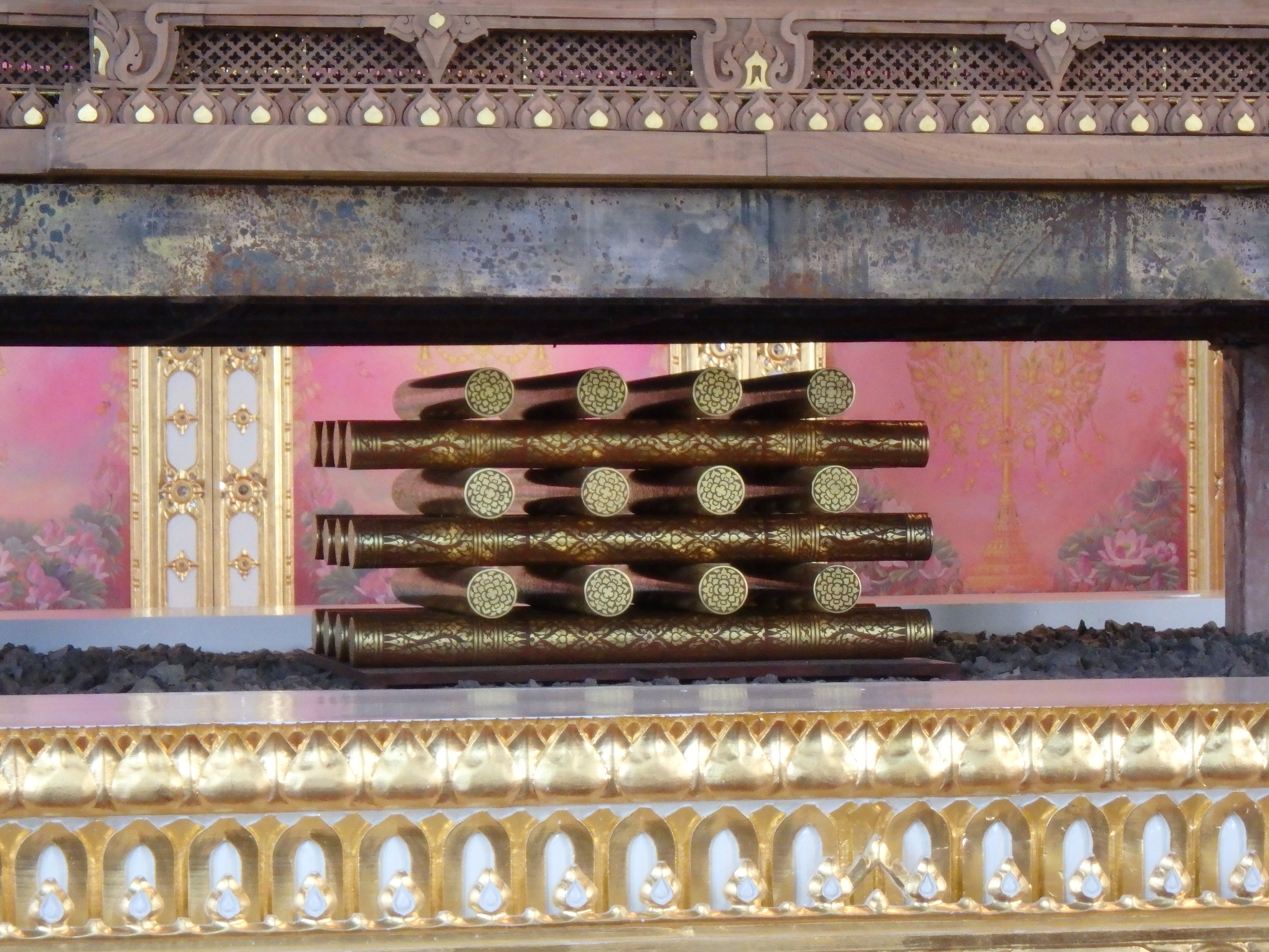 | คำอธิบาย : ท่อนฟืนไม้จันทน์ลายรดน้ำประกอบพระบรมราชอิสริยยศ ในพระราชพิธีถวายพระเพลิงพระบรมศพ พระบาทสมเด็จพระปรมินทรมหาภูมิพลอดุลยเดช จัดแสดง ณ โรงราชรถ พิพิธภัณฑสถานแห่งชาติ พระนคร |