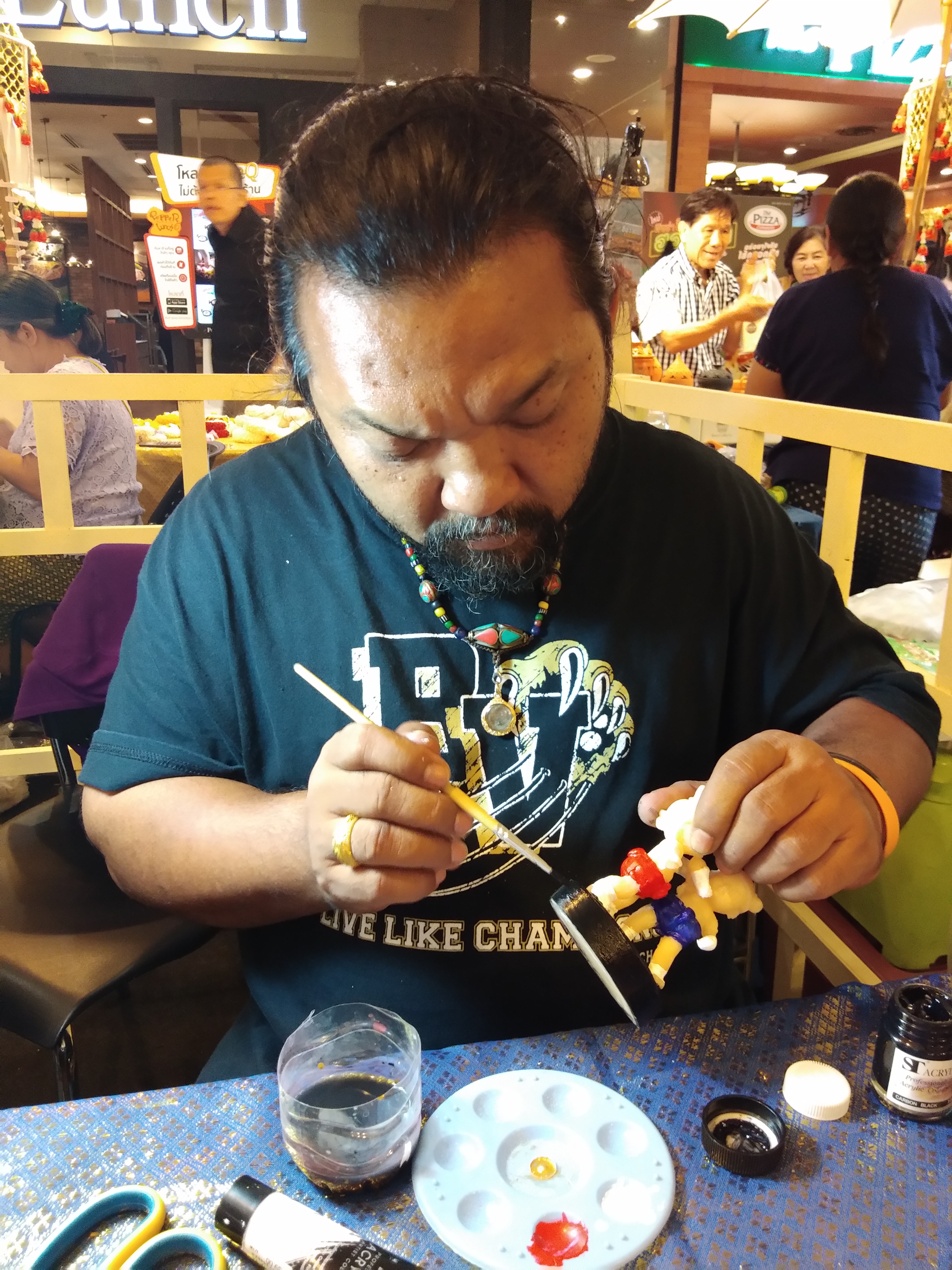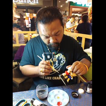 | คำอธิบาย : เทวากร ศรีสมัย หรือ ช่างหน่อง ได้รับการฝึกฝนและซึมซับ การทำหัวโขน การเขียนลายหน้า ตามตัวละครรามเกียรติ์ มาตั้งแต่จำความได้ โดยมี อาจารย์การัญ ศรีสมัย ผู้เชี่ยวชาญทางงานหัตถศิลป์ และวิจิตรศิลป์ ผู้เป็นบิดาเป็นต้นแบบถ่ายทอด มีผลงานให้เห็นเป็นเชิงประจักษ์ ในระดับโอท๊อป ของเขตราชบูรณะ กรุงเทพมหานคร และเป็นสมาชิกศูนย์ส่งเสริมศิลปาชีพระหว่างประเทศ (ศศป.) ภายใต้การกำกับดูแลของกระทรวงพาณิชย์ เป็นวิทยากรร่วมกับกระทรวงวัฒนธรรมแห่งประเทศไทย บรรยายขั้นตอนการทำหัวโขน การลงสี การลงทอง การเจาะประดับพลอย เพื่อการส่งเสริมความรู้ทางด้านการเผยแพร่และการอนุรักษ์ศิลปวัฒนธรรมไทย ได้รับการคัดสรรผลงานการทำหัวโขนจากบางกอกแบนด์ ในระดับพรีเมี่ยม ประจำปี ๒๐๑๘ ช่างหน่องได้ถ่ายทอดความรู้ความสามารถทั้งหมดส่งต่อ นายกฤติย ศรีสมัย เป็นรุ่นที่ ๓ ช่างหน่อง หัวโขนเล็ก_ไทยธรรม ๕๑ สุขสวัสดิ์๕๘ เขตราชบูรณะ กทม. ๑๐๑๔๐ โทรศัพท์ ๐๘๑-๔๐๘-๒๙๔๙ |