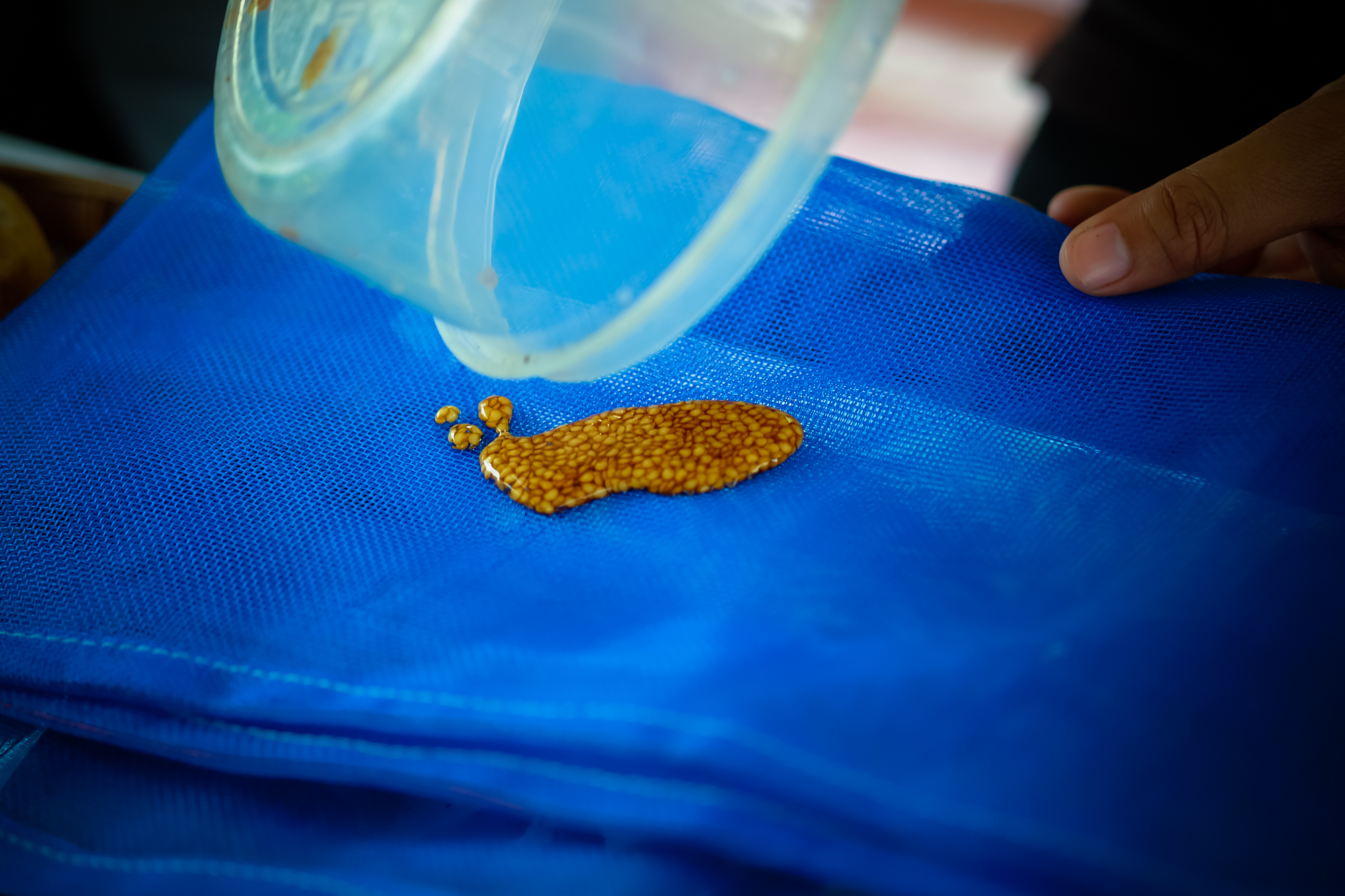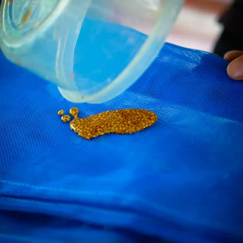 | คำอธิบาย : เทเมล็ดที่แช่น้ำ บนถุงตาข่าย |