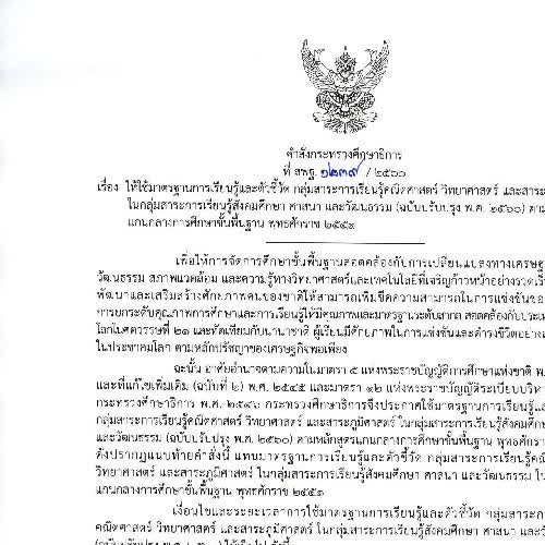 "คำสั่งกระทรวงศึกษาธิการให้ใช้มาตรฐานการเรียนรู้และตัวชี้วัด กลุ่มสาระการเรียนรู้คณิตศาสตร์ วิทยาศาสตร์ และสาระภูมิศาสตร์ ฉบับปรับปรุง พ.ศ. 2560".