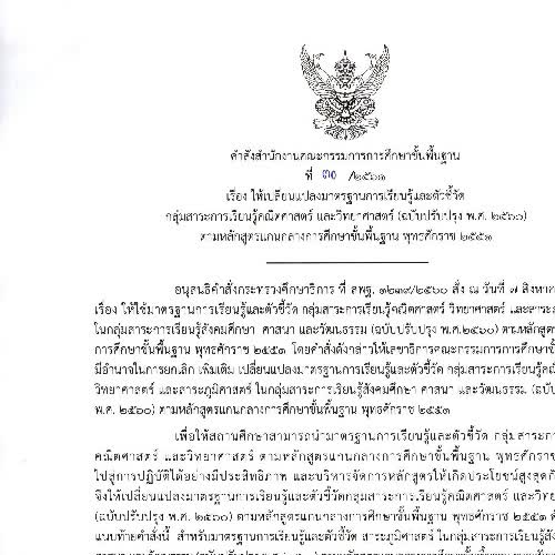 "คำสั่ง สพฐ. ให้เปลี่ยนแปลงมาตรฐานการเรียนรู้และตัวชี้วัด กลุ่มสาระการเรียนรู้คณิตศาสตร์ และ วิทยาศาสตร์ ฉบับปรับปรุง พ.ศ. 2560".